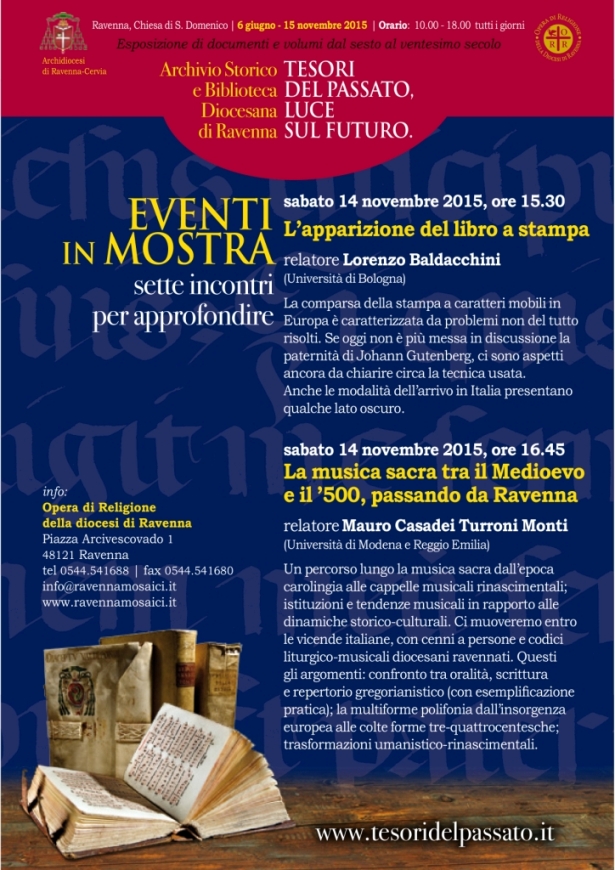 Si segnalano i prossimi eventi organizzati dall’Arcidiocesi di Ravenna-Cervia e dall’Opera di Religione della diocesi di Ravenna: L’apparizione del libro a stampa, relatore Lorenzo Baldacchini, e: La musica sacra tra il Medioevo e il ’500, passando da Ravenna, relatore Mauro Casadei Turroni Monti. I due eventi si terranno all’interno della mostra Tesori del passato, luce sul futuro, allestita presso la chiesa di S. Domenico, in via Cavour, a Ravenna, sabato, 14 novembre 2015, alle ore 15:30 e alle ore 16:45.