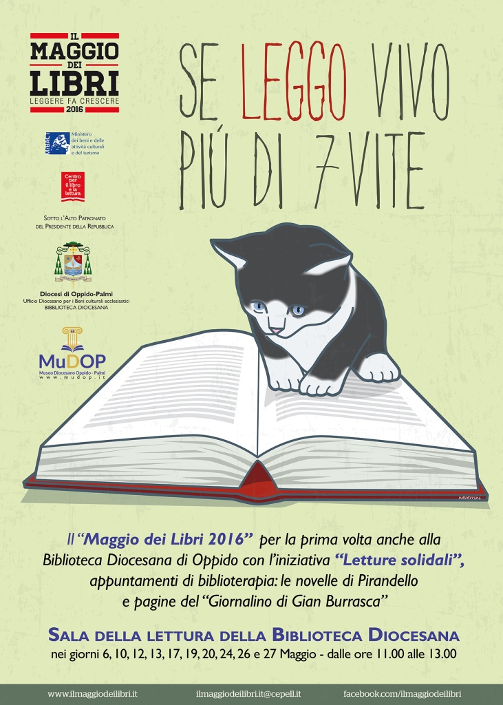Per il primo anno la Biblioteca Diocesana di Oppido Mamertina aderisce al “Maggio dei Libri 2016”, la campagna nazionale promossa dal Cepell (Centro per il libro e la lettura) e dal Ministero per i Beni e le attività culturali, iniziativa che vuole sottolineare l’importanza della lettura per la crescita culturale e civile non solo del singolo individuo ma del territorio tutto.