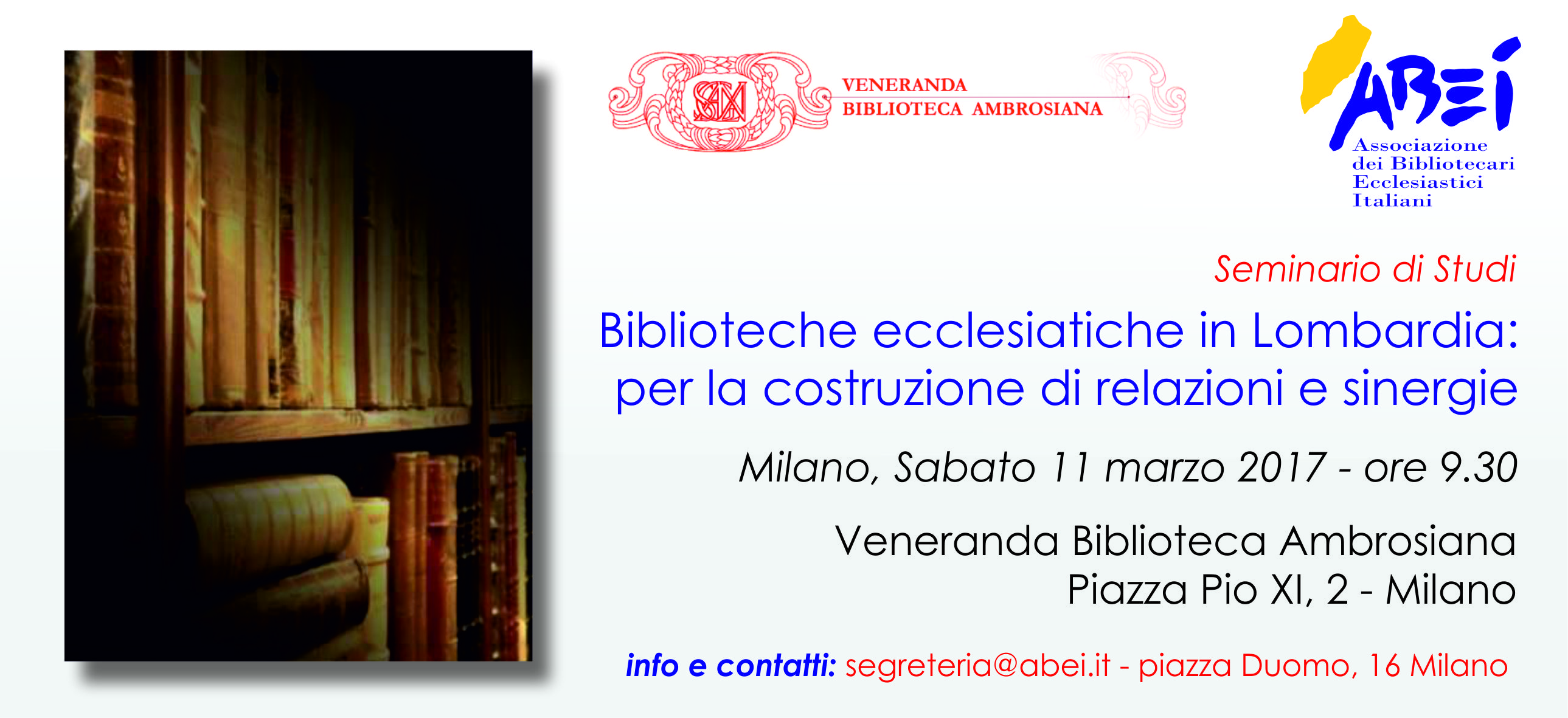 Il prossimo 11 marzo, con inizio alle ore 9.30, presso la Biblioteca Ambrosiana (Milano, piazza Pio XI, 2) si svolgerà una mattinata di studio dal titolo: Biblioteche ecclesiastiche in Lombardia: per la costruzione di relazioni e sinergie.